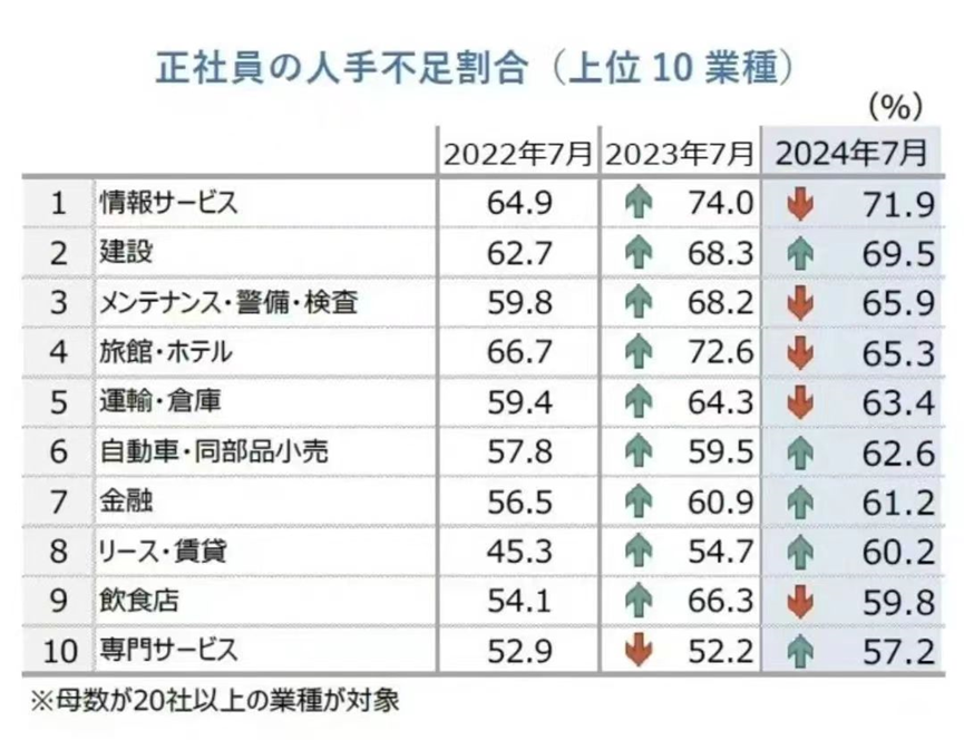 紧随其后的是建筑业。受到“2024年问题”影响,建筑业正社员缺人率为69.2%,三年间不断上涨至近7成,其中工人、建筑设计师、工程师等职位同样紧缺。大型基础设施建设和住宅需求的增加,使得该行业对劳动力的需求持续扩大。