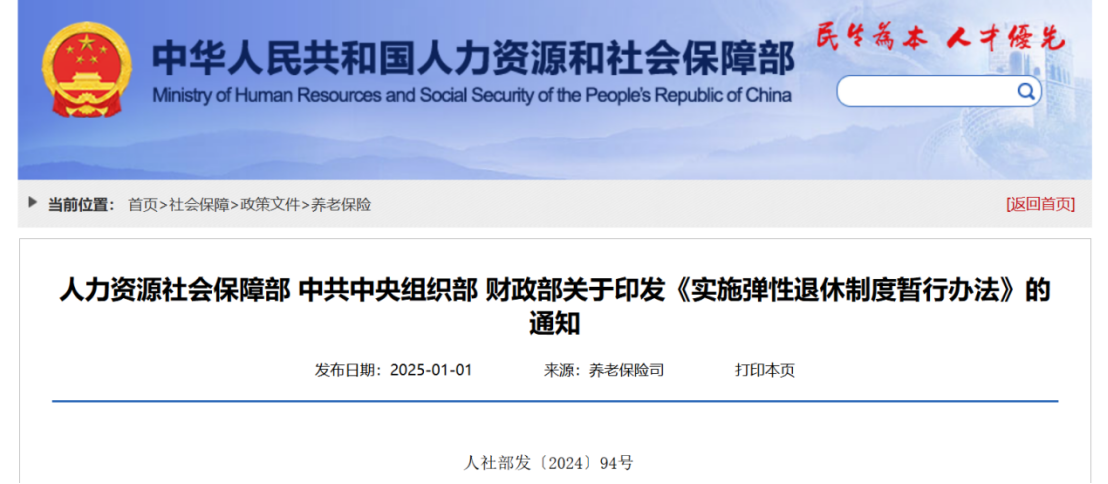 人力资源社会保障部等部门于2025年1月1日发布了《实施弹性退休制度暂行办法》。
